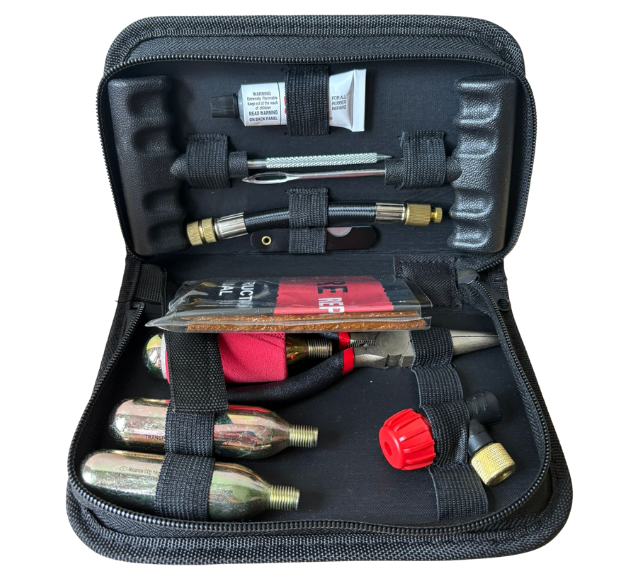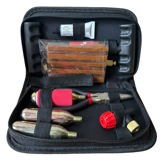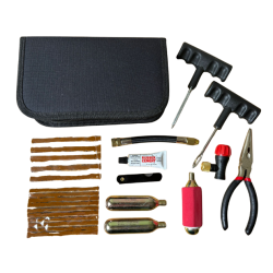 Zestaw naprawczy to niezbędne wyposażenie każdego motocyklisty. Pozwala na błyskawiczną naprawę przebitej opony bezdętkowej w trasie, bez konieczności demontażu koła. Zestaw zawiera wszystkie narzędzia potrzebne do załatania dziury oraz naboje z dwutlenkiem węgla (CO2) do natychmiastowego napompowania koła.