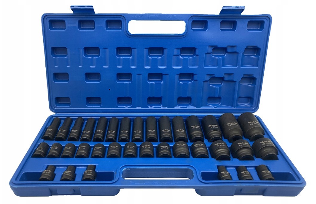 Zestaw nasadek udarowych 1/2 - 12 - KĄTNE długich, składa się z 35 elementów. Zawiera nasadki udarowe w popularnych rozmiarach od 8 do 32 mm.